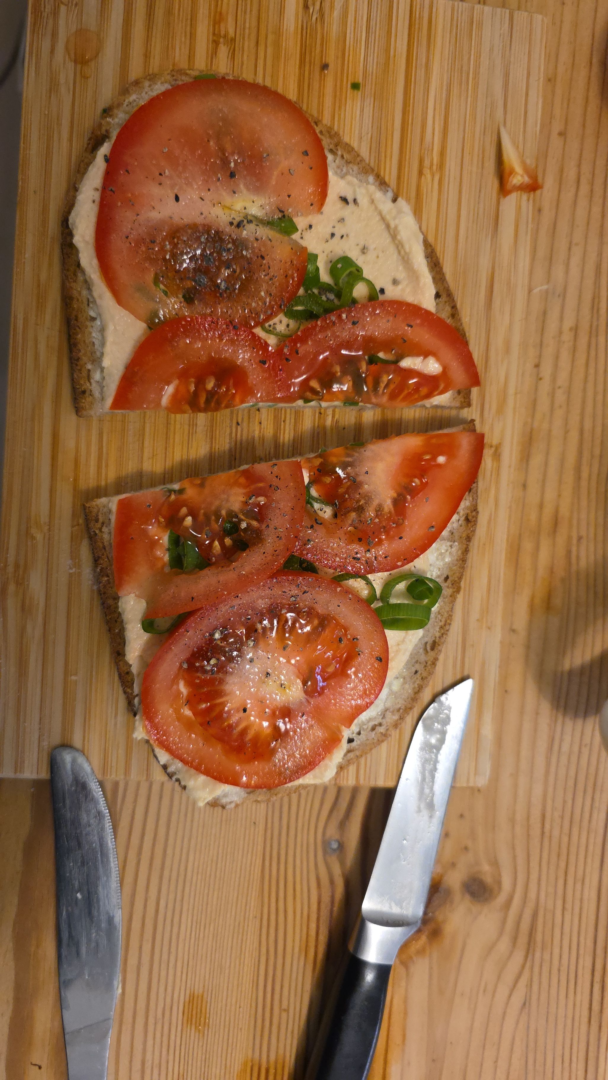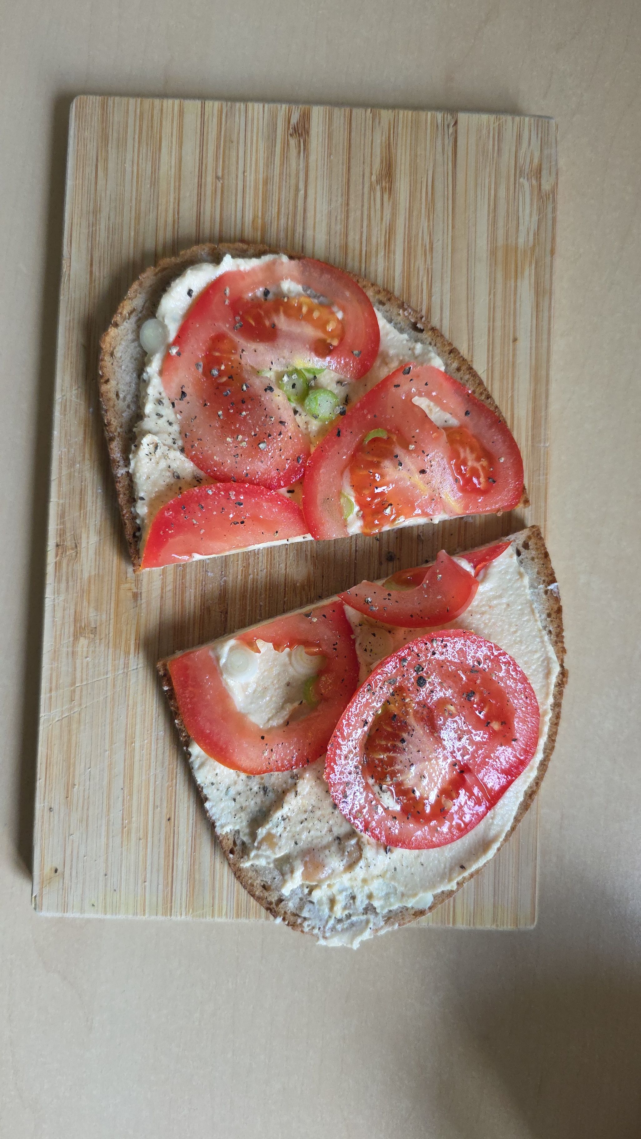The meal is a piece of bread topped with hummus, tomato slices, and green onions, seasoned with black pepper. Estimating the nutritional content, this meal might have around 250-300 calories. The carbohydrates mainly come from the bread, likely providing around 30-40 grams. Sodium content would depend on the hummus and bread used, but it could be moderate to high due to processed ingredients in both. Cholesterol is naturally low in these ingredients. For someone with hypertension, this meal could be suitable if lower-sodium bread and hummus are used, but checking the specific sodium content in your ingredients is important.