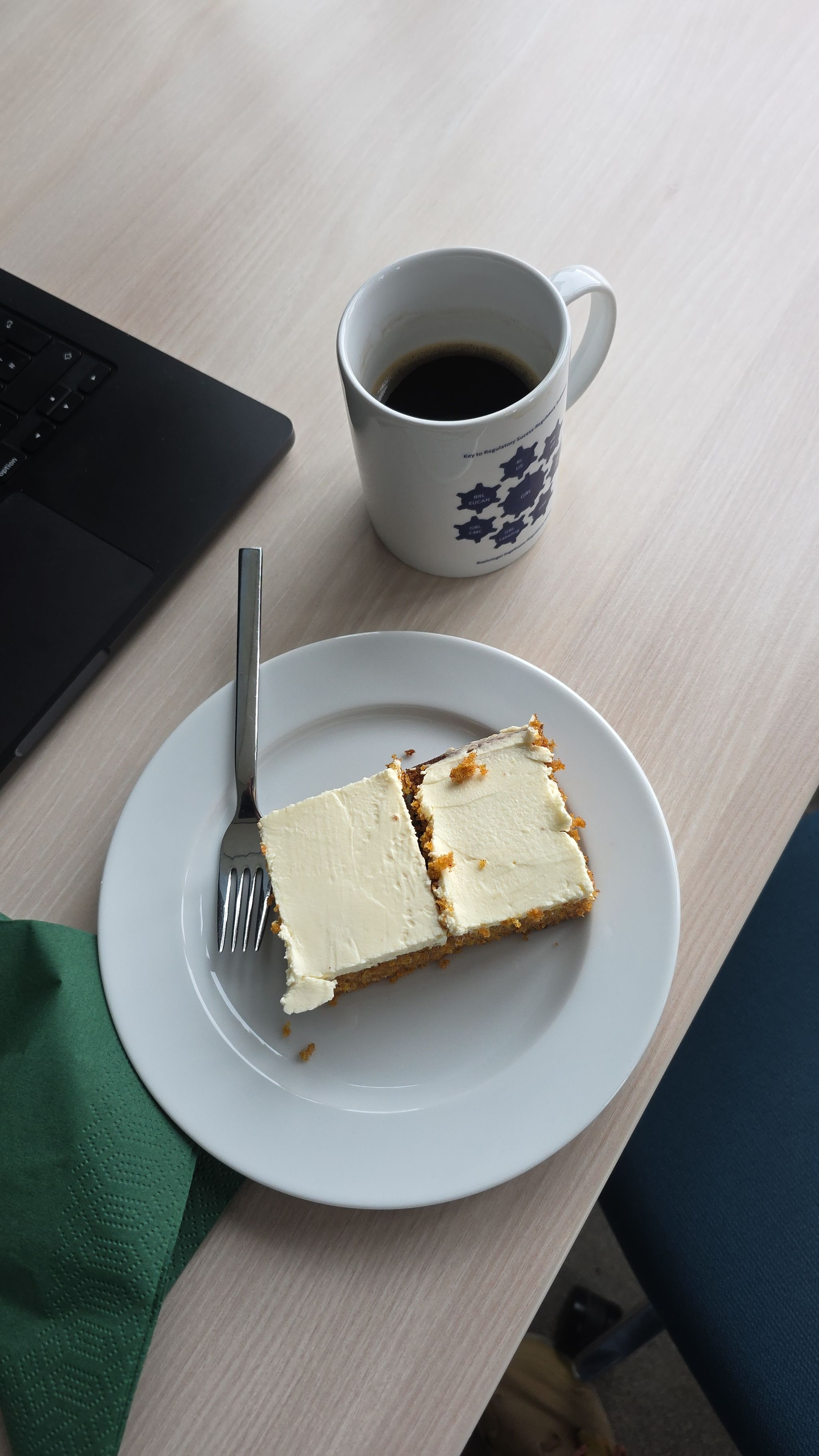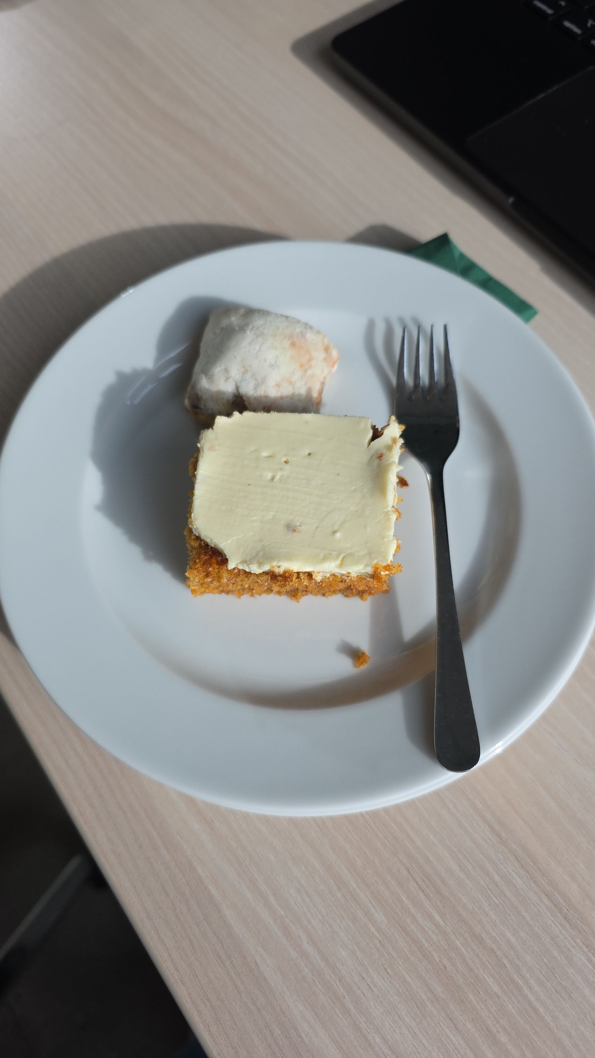 The meal consists of a slice of cake with frosting and what appears to be a small pastry or biscuit. The cake, likely carrot or spice with a cream cheese frosting, might contain around 250-350 calories. The pastry could add another 150-200 calories. In terms of carbohydrates, the cake slice may have approximately 30-50 grams, while the pastry could add roughly 20-30 grams.