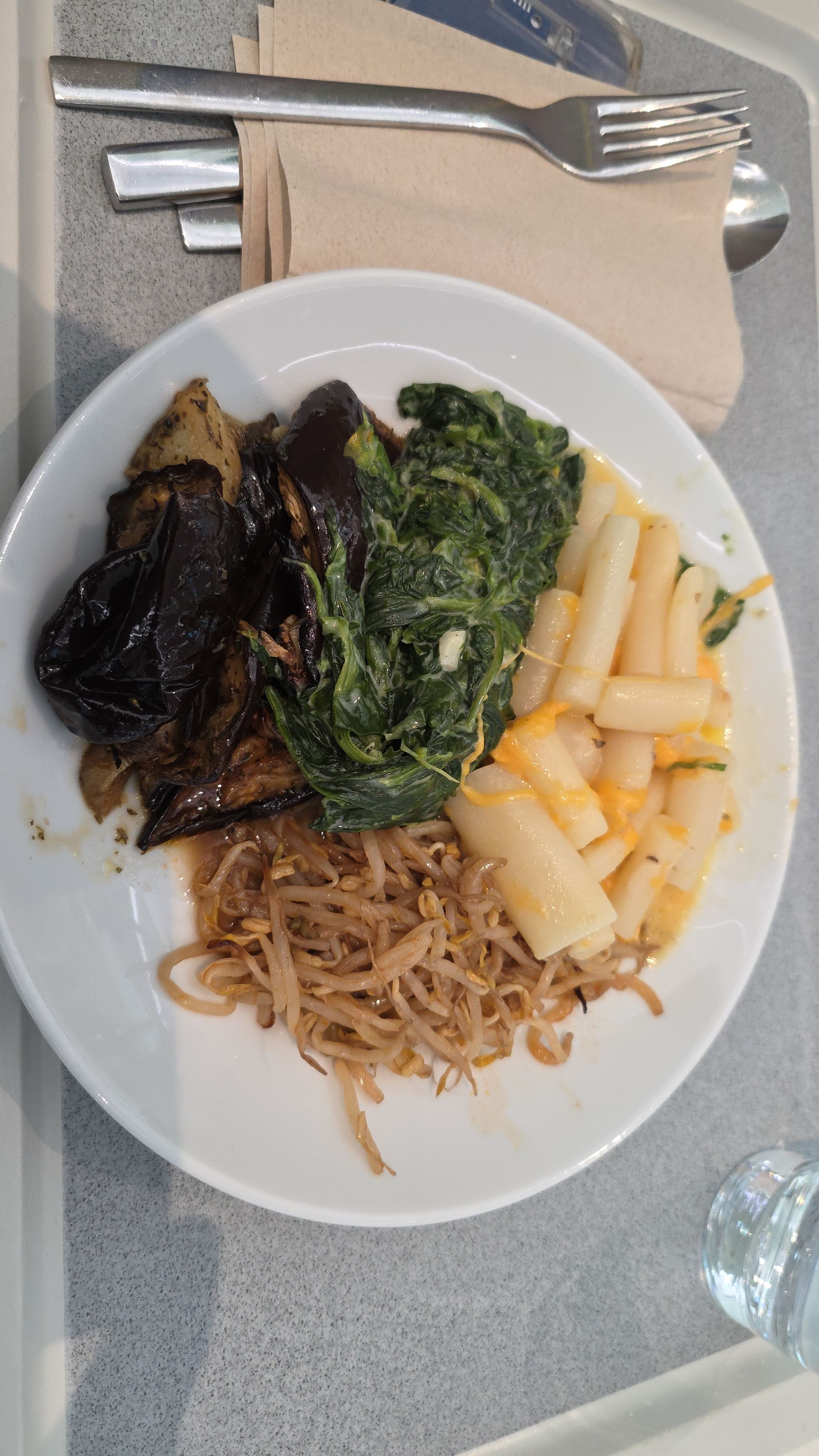 The meal consists of sautéed eggplant, spinach, rice cakes, and bean sprouts. This dish likely contains around 300-500 calories, with most of the calories and carbohydrates coming from the rice cakes. It’s a low-fat dish, likely lower in cholesterol, and depending on how it’s seasoned, it might be moderate in sodium. For someone with hypertension, this meal is generally suitable, especially since it contains vegetables and is low in cholesterol. However, it's important to ensure the sodium content is not excessive, possibly by using low-sodium seasonings.