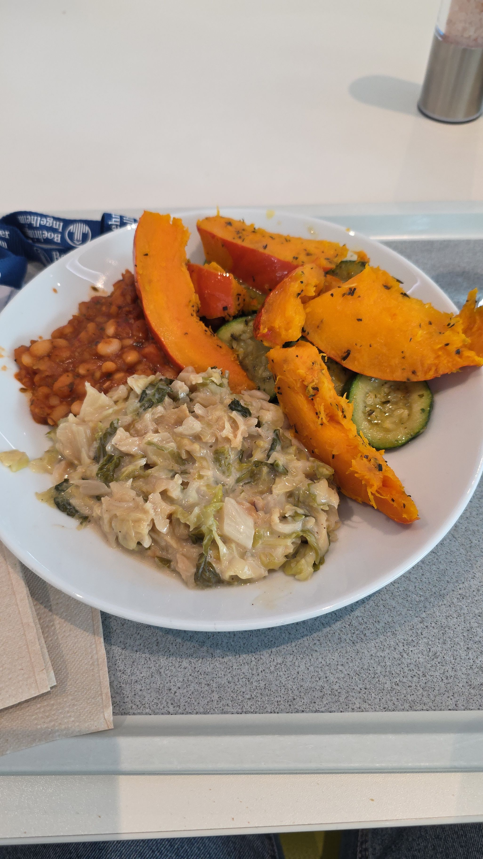 The meal features baked beans, roasted squash and zucchini, and what appears to be a creamy cabbage dish. It's likely moderate in calories, around 400-600 calories, depending on portion sizes. The baked beans and squash contribute a good amount of carbohydrates, possibly around 60-80 grams. Sodium content may be elevated due to the beans and creamy element, and you can expect some cholesterol in the creamy cabbage, though it’s not very high overall.