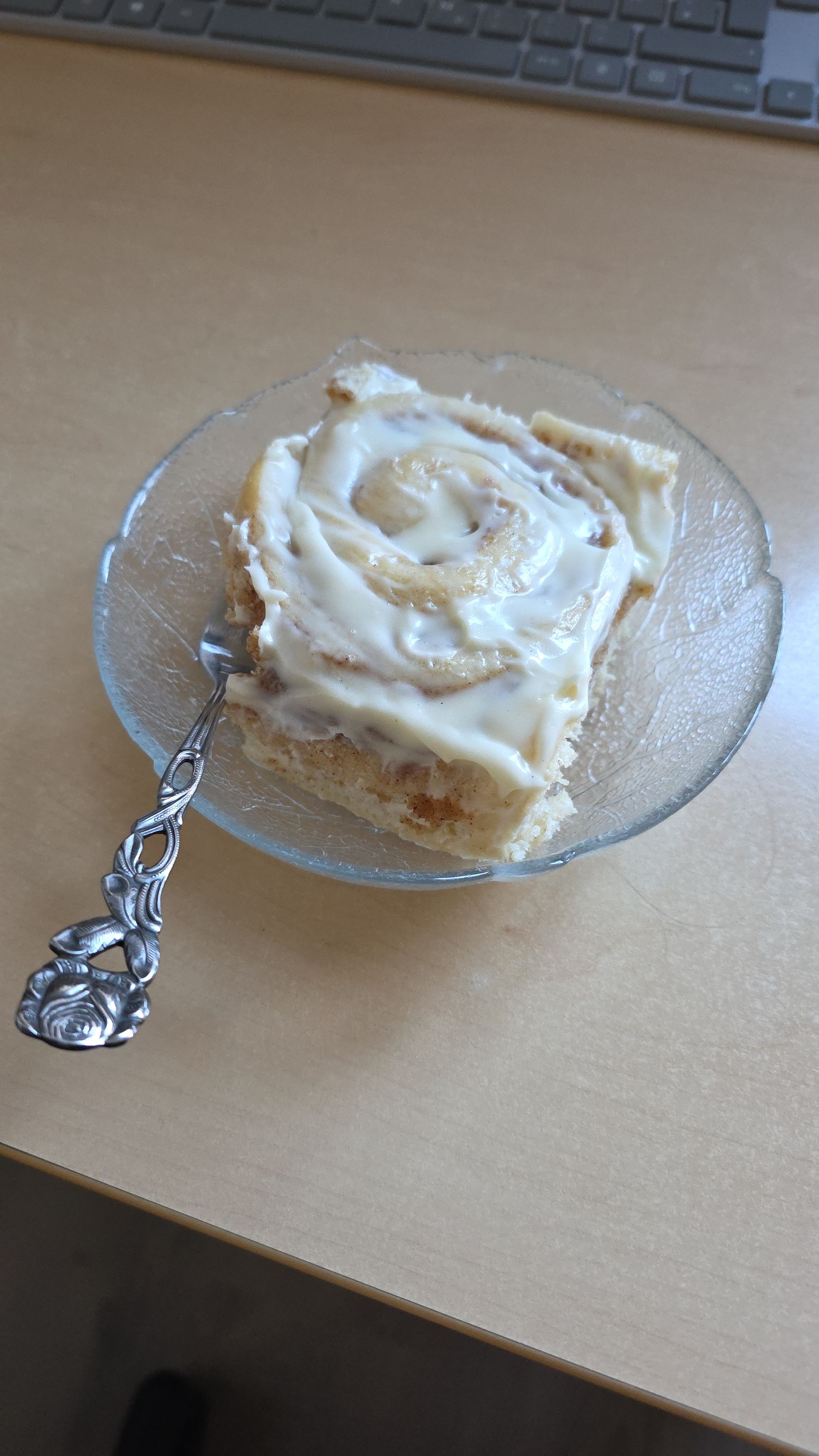 The image shows a cinnamon roll with icing served in a glass dish. Such a roll typically ranges between 300 to 500 calories. The carbohydrate content can be approximately 50 to 70 grams. It's likely to have moderate sodium levels, around 300 to 400 milligrams, and a moderate cholesterol content due to butter and cream cheese in the icing. For someone with hypertension, this meal would not be ideal due to its sugar content, potential sodium, and saturated fats. It’s best to consume such treats in moderation and with dietary guidance if needed.