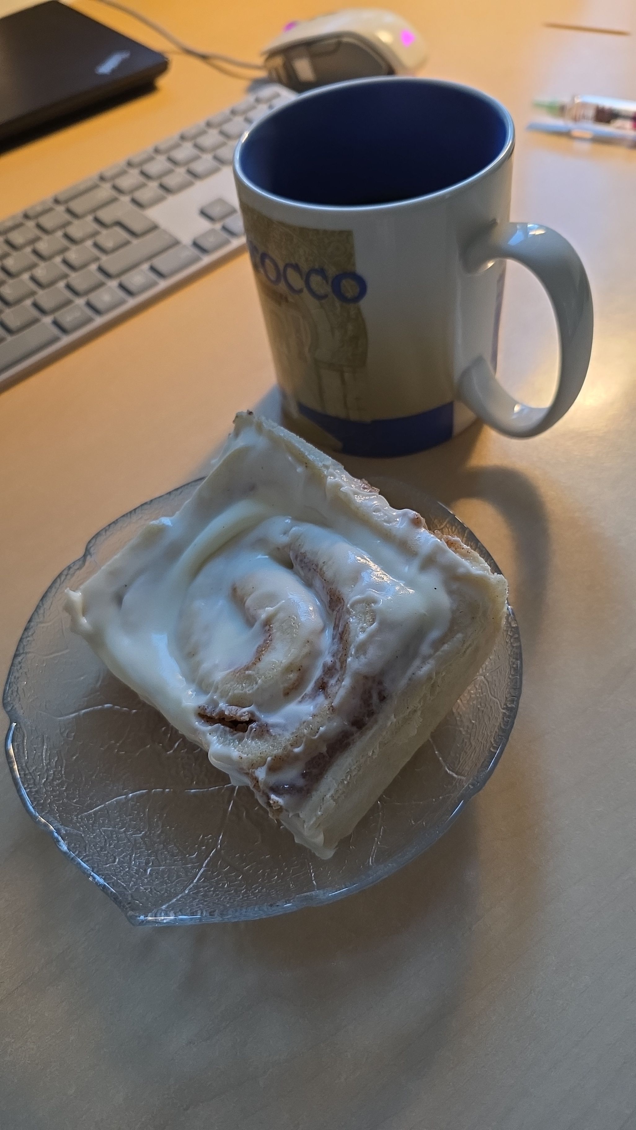 The meal consists of a cinnamon roll with icing, accompanied by a mug of what appears to be coffee or tea. A typical cinnamon roll with icing can contain around 300-500 calories and approximately 50-70 grams of carbohydrates. The sodium content might be between 300-500 milligrams, and the cholesterol content can be about 20-30 milligrams, depending on the recipe and serving size.