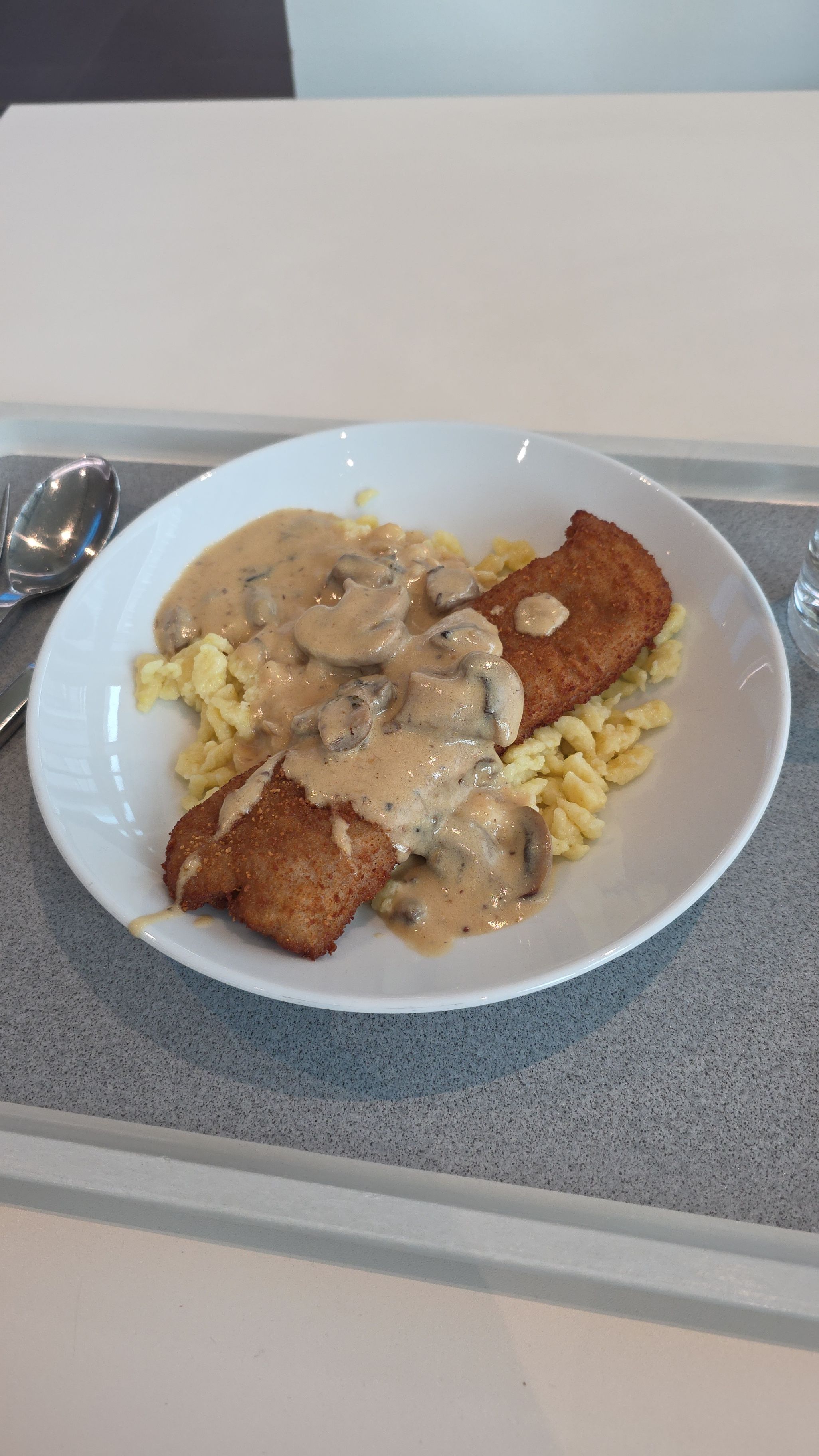 The meal consists of breaded, fried fish fillets topped with a creamy mushroom sauce, served over noodles. Considering the preparation and ingredients, this dish might contain roughly 600-800 calories. The noodles and breading contribute a significant amount of carbohydrates, possibly around 70-90 grams. Due to the creamy sauce and fried fish, the sodium content is likely high, potentially exceeding 1000 mg, which is a concern for individuals with hypertension. The dish might also be high in cholesterol because of the cream and frying process. Overall, this meal might not be recommended for someone managing hypertension due to its high sodium and possible cholesterol content.