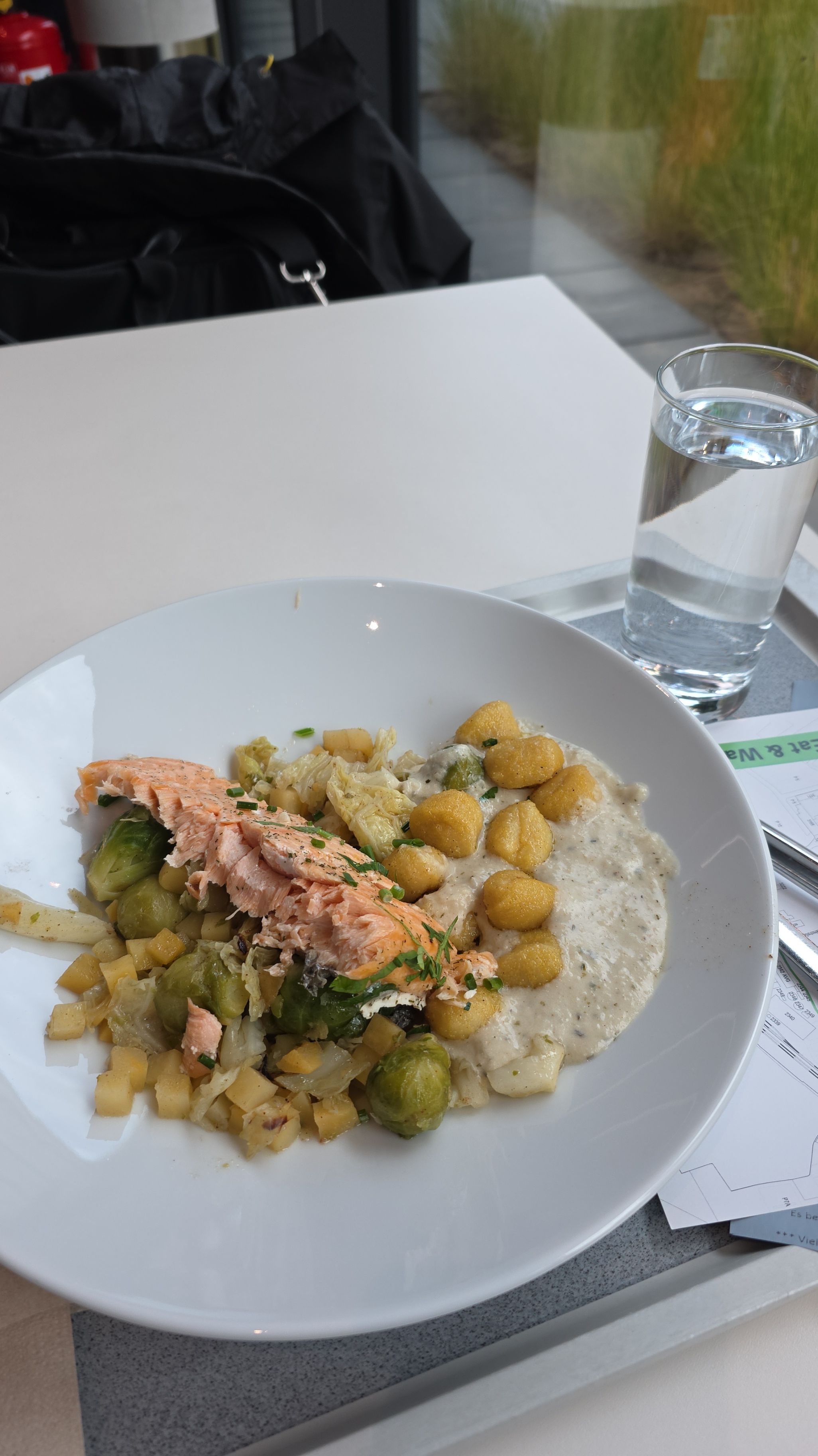 The meal consists of cooked salmon, Brussels sprouts, potatoes, gnocchi, cabbage, and a creamy sauce. This dish is likely to have around 600-800 calories, primarily due to the salmon and creamy sauce. The carbohydrates come mainly from the gnocchi and potatoes, estimating about 50-70 grams. The sauce and salmon could contribute a moderate amount of sodium, which could be a concern for someone with hypertension, depending on additional seasonings. The salmon provides some cholesterol, but its omega-3 fatty acids are heart-healthy. It's generally advisable for individuals with hypertension to moderate their intake of high-sodium foods, so the sauce might be a point to consider.