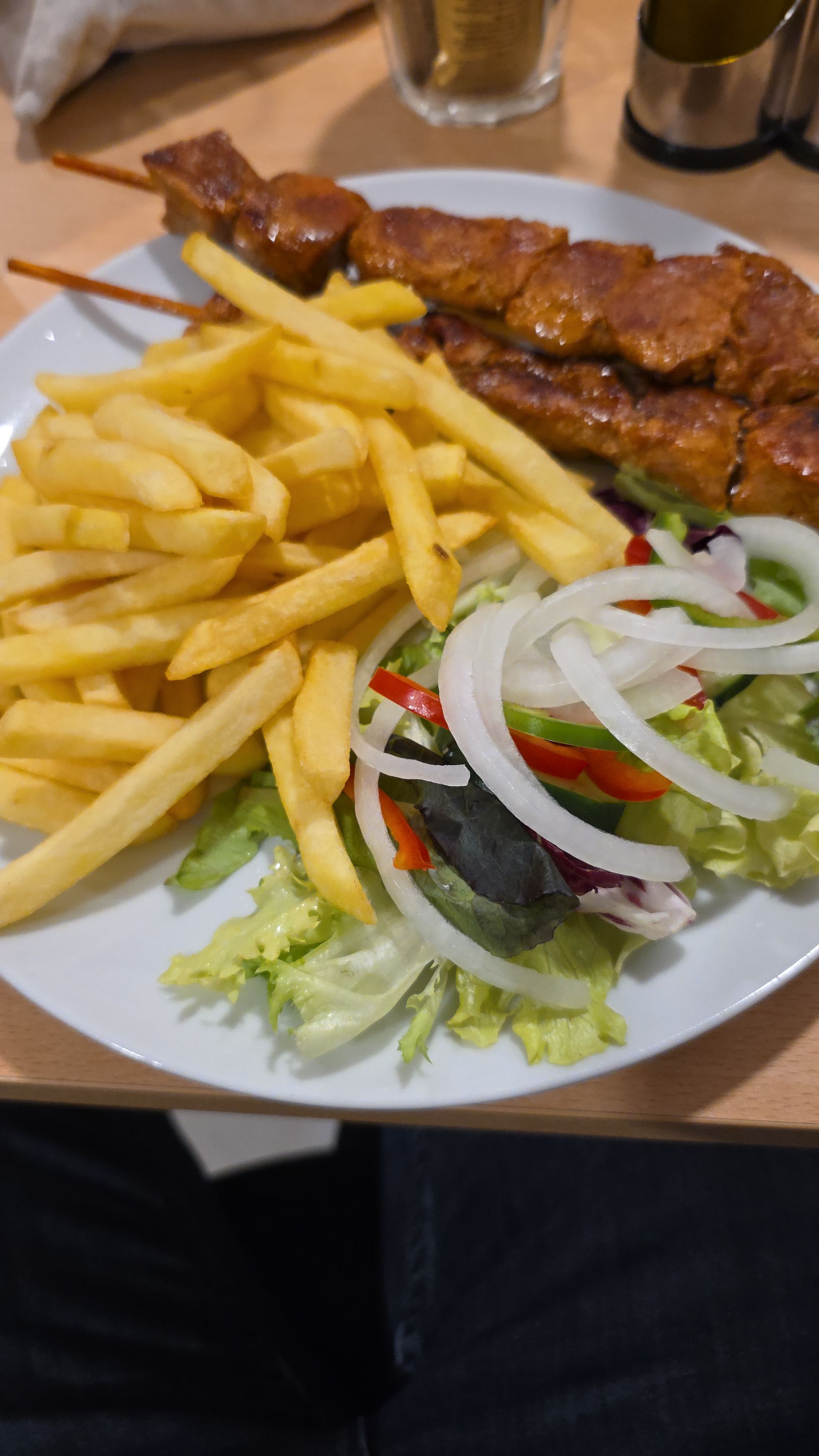 The meal contains grilled skewers, likely meat-based, accompanied by a portion of French fries and a side salad with lettuce, onions, and bell peppers. The calorie content for the entire meal might range from 600 to 1000 calories, depending on portion sizes and preparation methods. The fries contribute most of the carbohydrates, likely around 50-70 grams. Sodium content could be high, especially if the meat and fries are seasoned; it might range anywhere from 600 to 1500 mg. Cholesterol will be present mainly in the grilled meat.