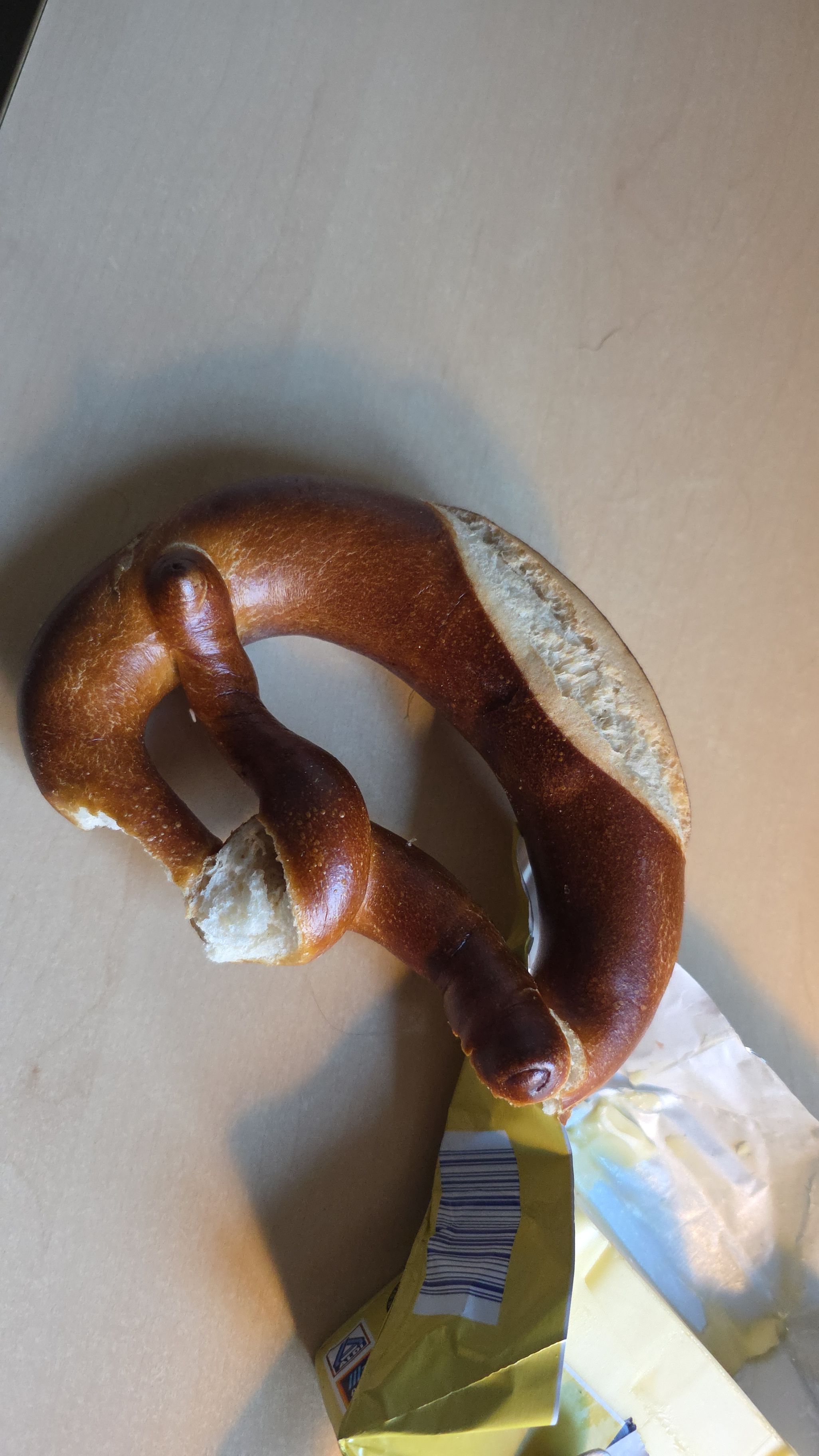 The image shows a pretzel with some packaging that might contain butter. A typical pretzel like this could have around 200 to 300 calories, with carbohydrates making up about 50 grams. Pretzels can be high in sodium, often containing up to 700 mg, which may not be ideal for someone with hypertension. However, cholesterol content is generally low in pretzels. If there's butter, it would add calories, fat, and cholesterol, further impacting dietary considerations for someone with hypertension. Reducing the amount of added butter could make it a better option for such individuals.