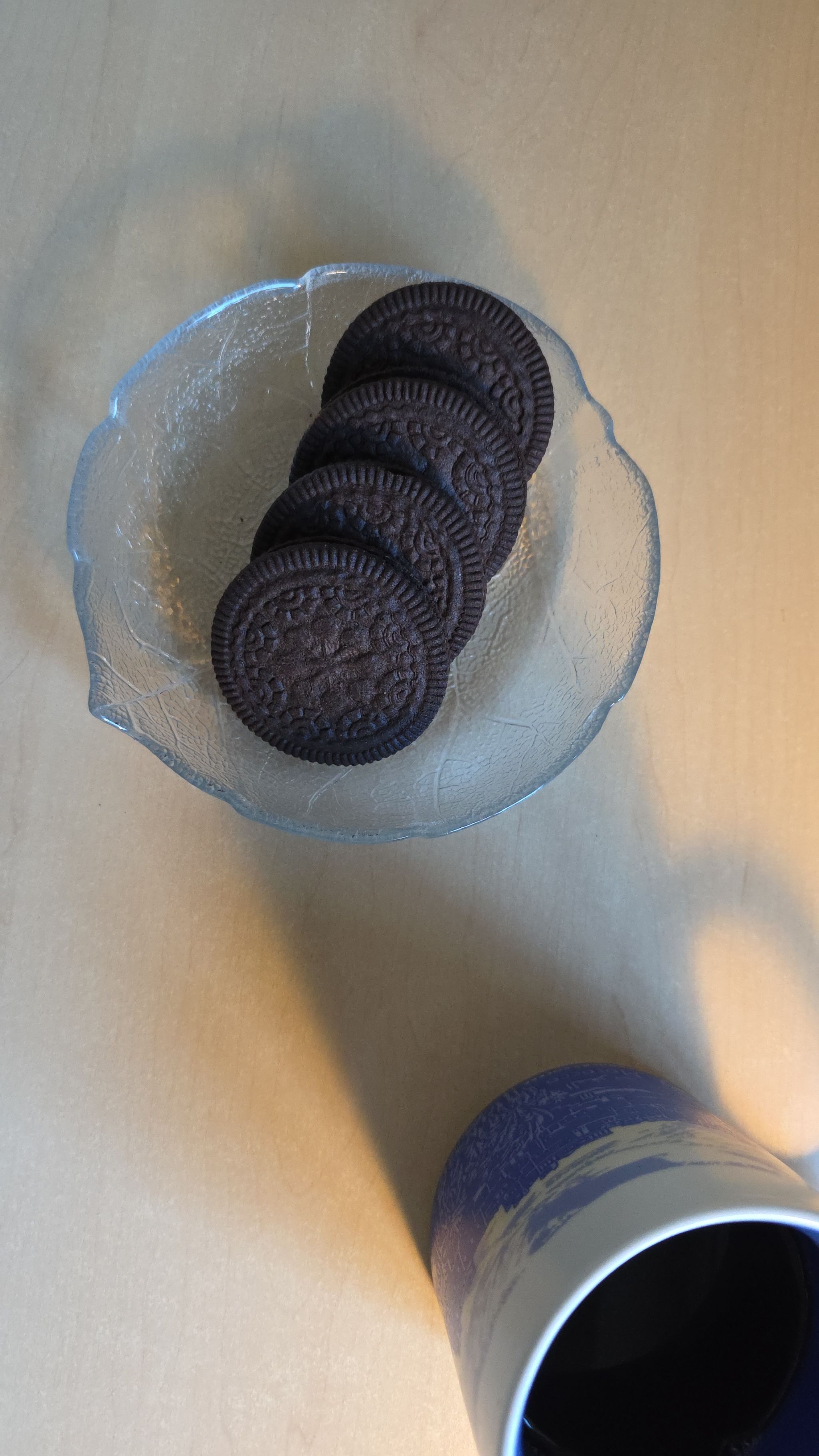 The meal consists of several chocolate sandwich cookies and a cup of black coffee. Each cookie is likely to have around 50 calories and about 8 grams of carbohydrates. The total calorie count for the cookies pictured is approximately 300 calories, assuming six cookies. Each cookie also contains about 80 mg of sodium and negligible cholesterol.