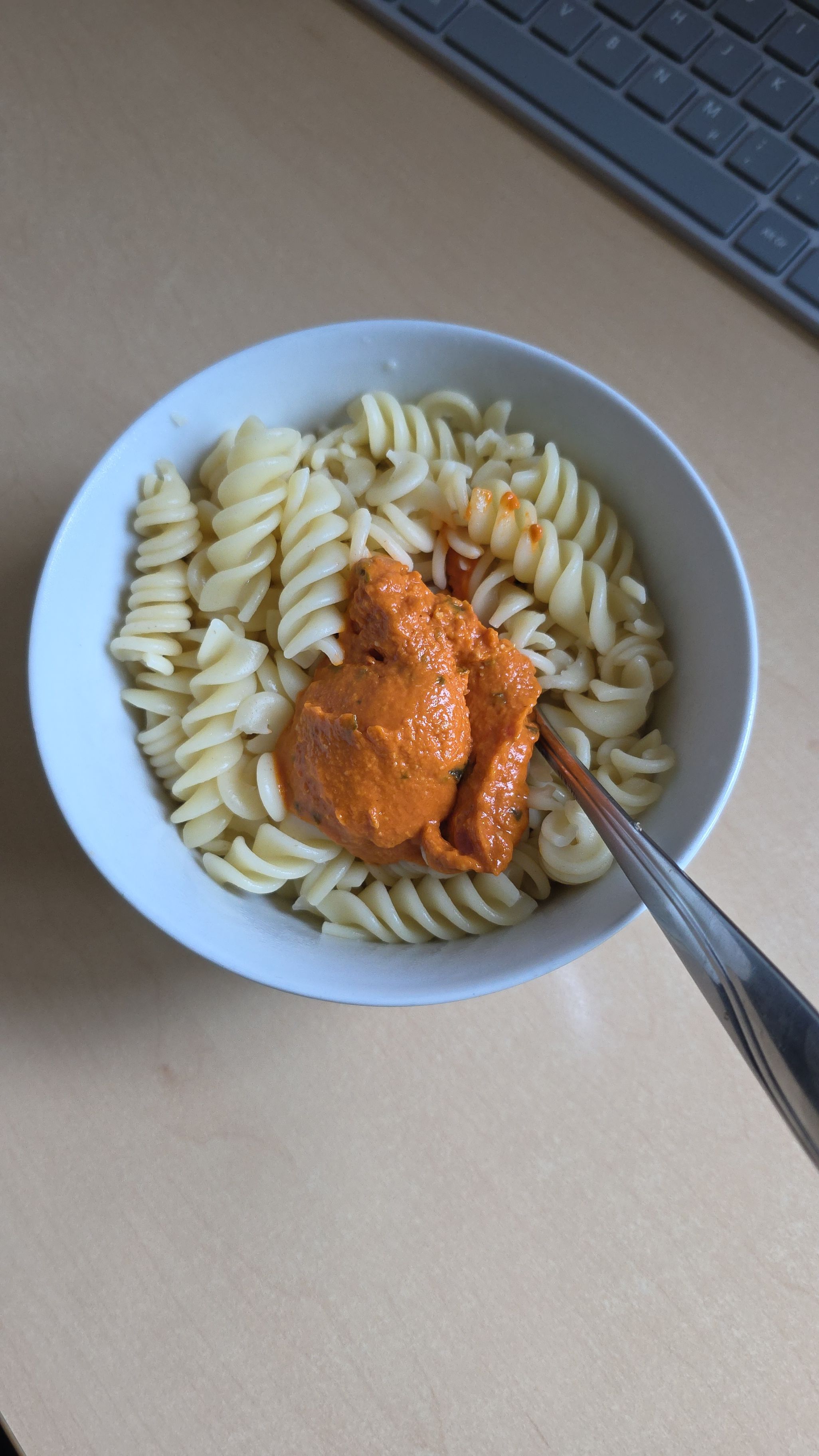 The meal consists of fusilli pasta with a tomato-based sauce. The pasta, likely 1 to 1.5 cups, contains around 200-300 calories and approximately 40-60 grams of carbohydrates. The sauce may add an additional 50-100 calories depending on its ingredients. The sodium content could vary significantly; if the sauce is pre-made, it might be high in sodium, possibly contributing 300-600 mg, but lower if homemade without added salt. Cholesterol levels are typically low in such meals unless cheese or meat is added. For someone with hypertension, caution is advised if the sauce is high in sodium, in which case opting for a low-sodium version would be preferable. Always tailoring meals with fresh ingredients is best to control sodium and overall health impact.