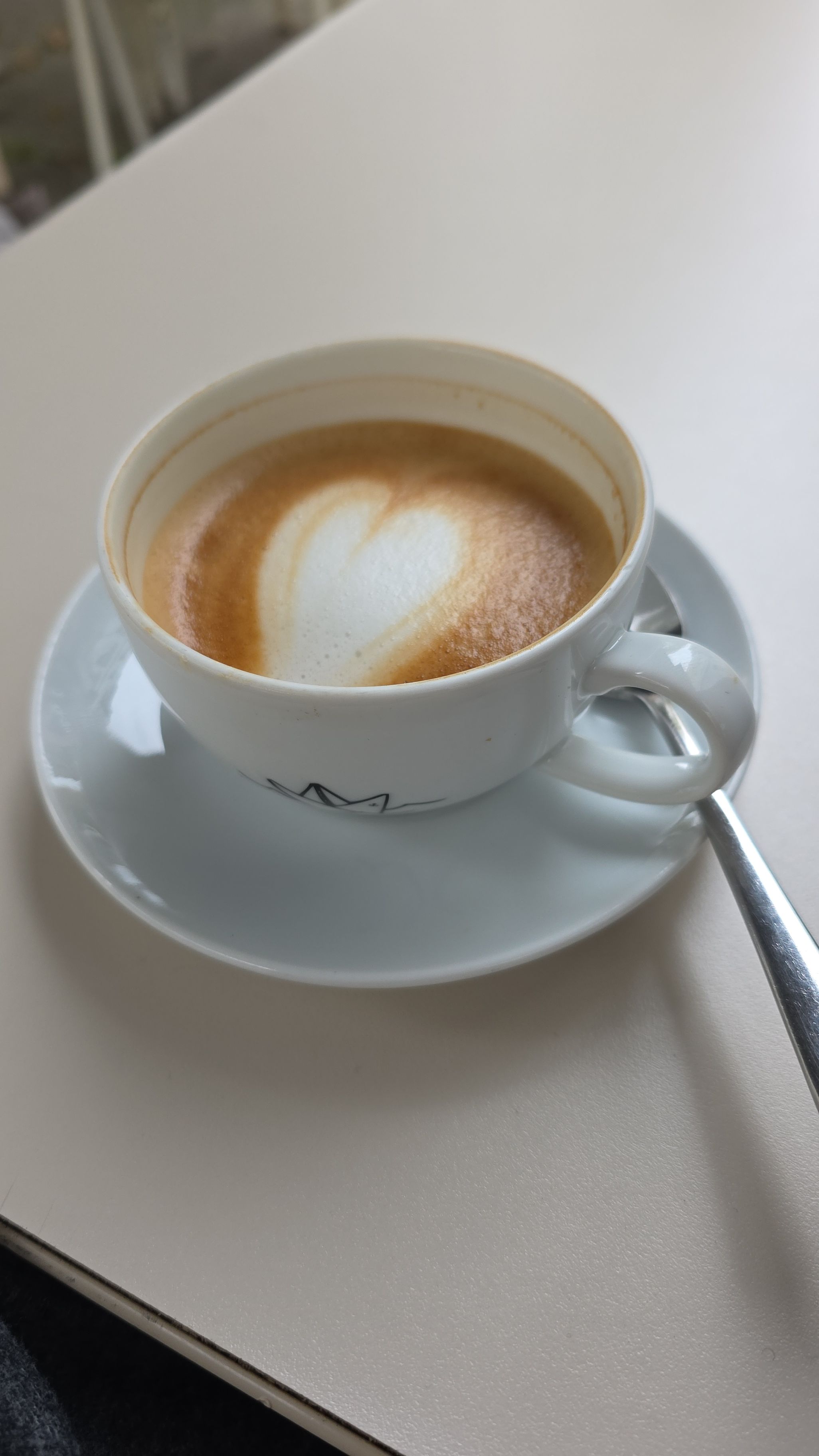The image shows a cup of cappuccino, which typically consists of espresso and steamed milk with a layer of foam. A cup like this usually contains around 70-120 calories, mostly from milk. It likely has about 10-12 grams of carbohydrates, primarily from lactose in the milk. Sodium and cholesterol content can vary, but typical values are around 60-100 mg of sodium and 5-15 mg of cholesterol, depending on the milk used. For someone with hypertension, a cup of cappuccino is generally acceptable, but it's important to monitor overall caffeine and sodium intake throughout the day.